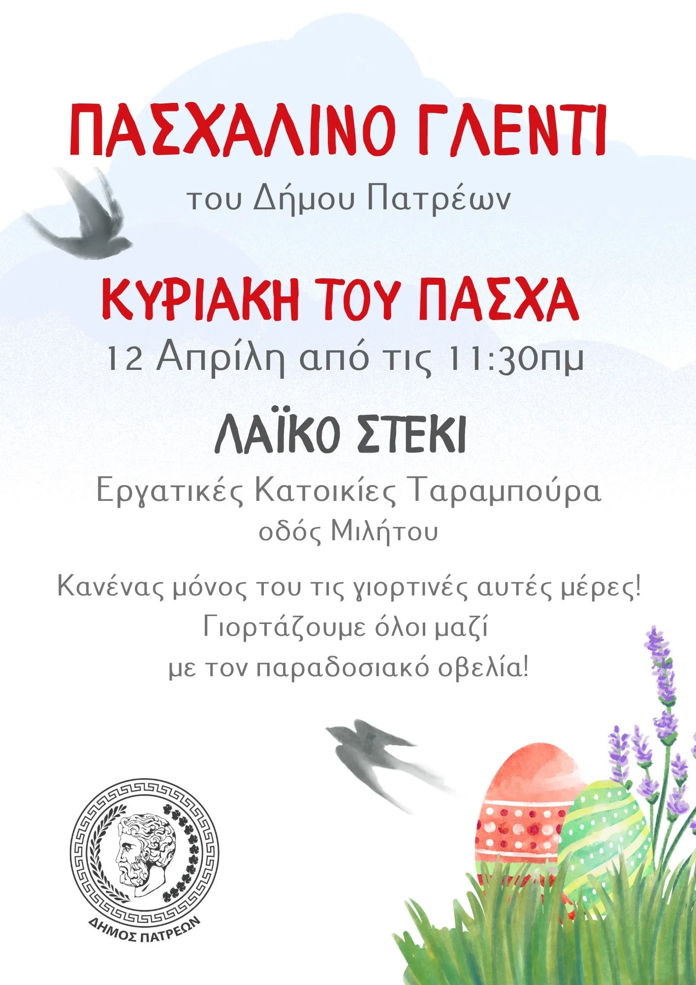 Για ακόμα μια χρονιά το Πασχαλινό γλέντι του Δήμου Πατρέων προετοιμάζεται στο Νότιο Διαμέρισμα και την Κυριακή του Πάσχα, 12 Απρίλη, θα πραγματοποιηθεί στο Λαϊκό Στέκι στις Εργατικές Κατοικίες Ταραμπούρα στα Ζαρουχλέικα, από τις 11.30 το πρωί.